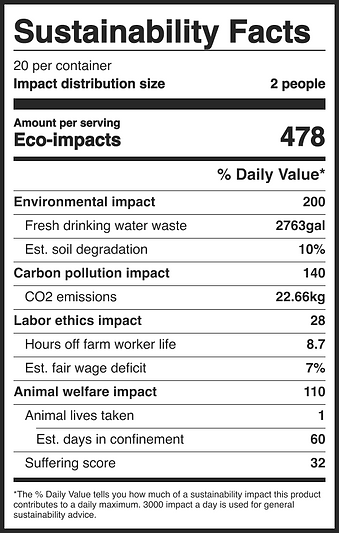I calculated the sustainability score values based on real data from the United Nations (UN) and the Water Footprint Calculator. I calculated the poultry farm labor ethics impact based on information from Science Direct Journal, the U.S. Bureau of Labor Statistics, the National Library of Medicine, the Oregon Health Authority, and the Humane League,.